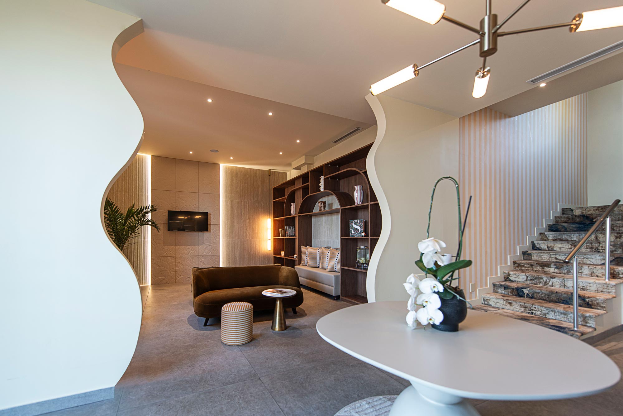 Les courbes inspirées des vagues sur les cloisons, fil rouge du projet, s’invitent dès l’entrée.