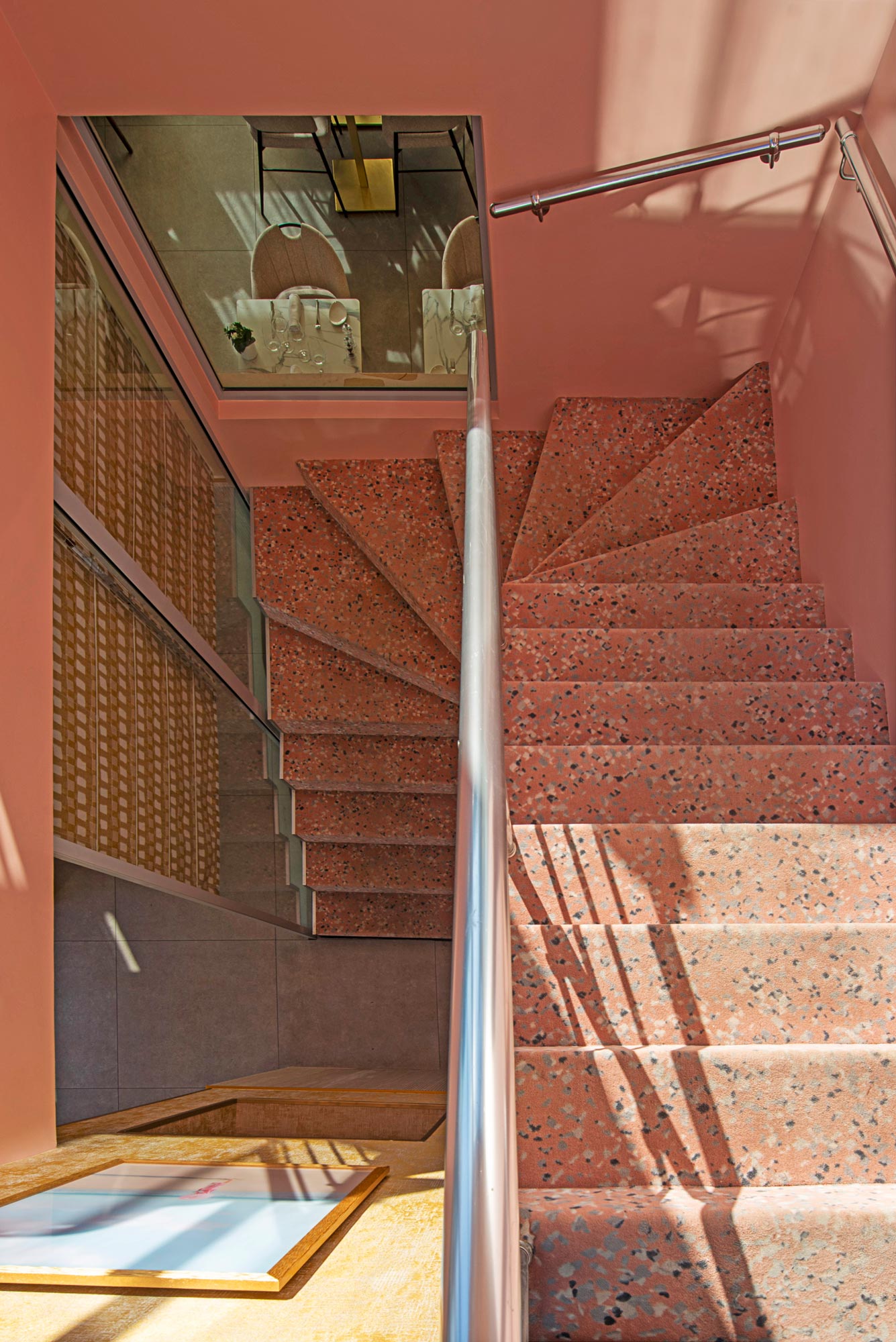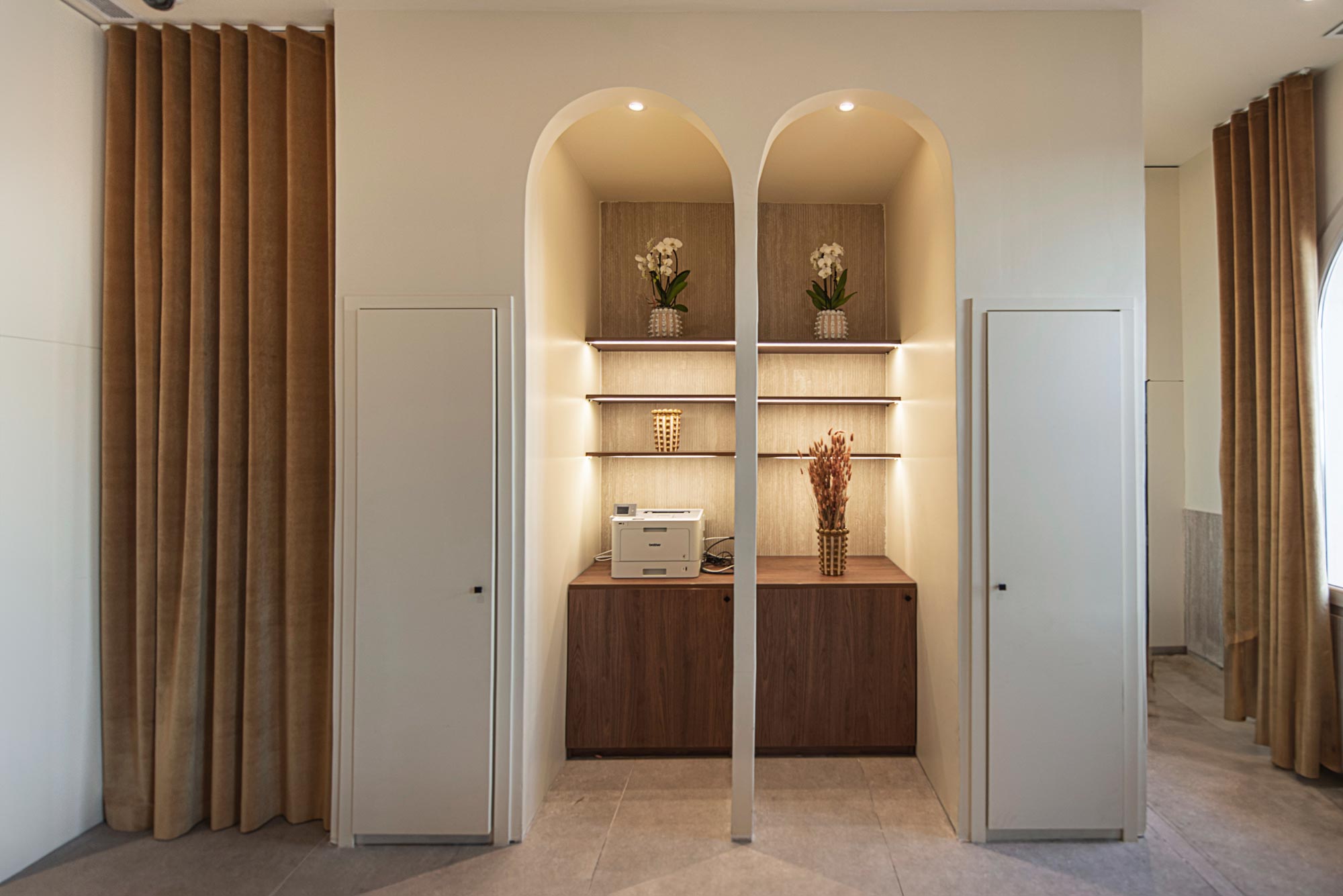 Les banquettes et rideaux conçus sur mesure, associées à une palette de teintes pastel : rosé poudré, crème, doré, composent une atmosphère douce et raffinée, baignée de lumière.