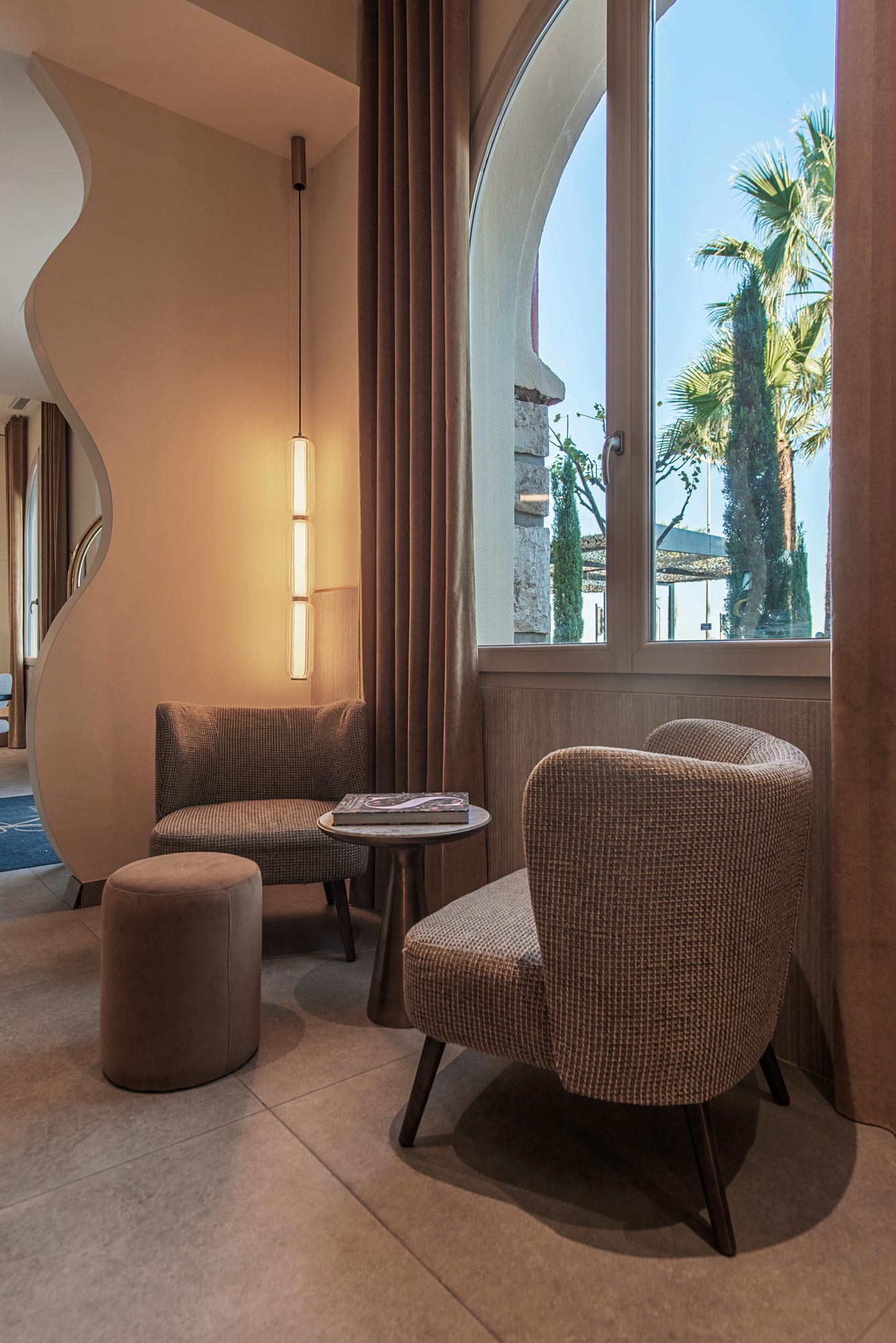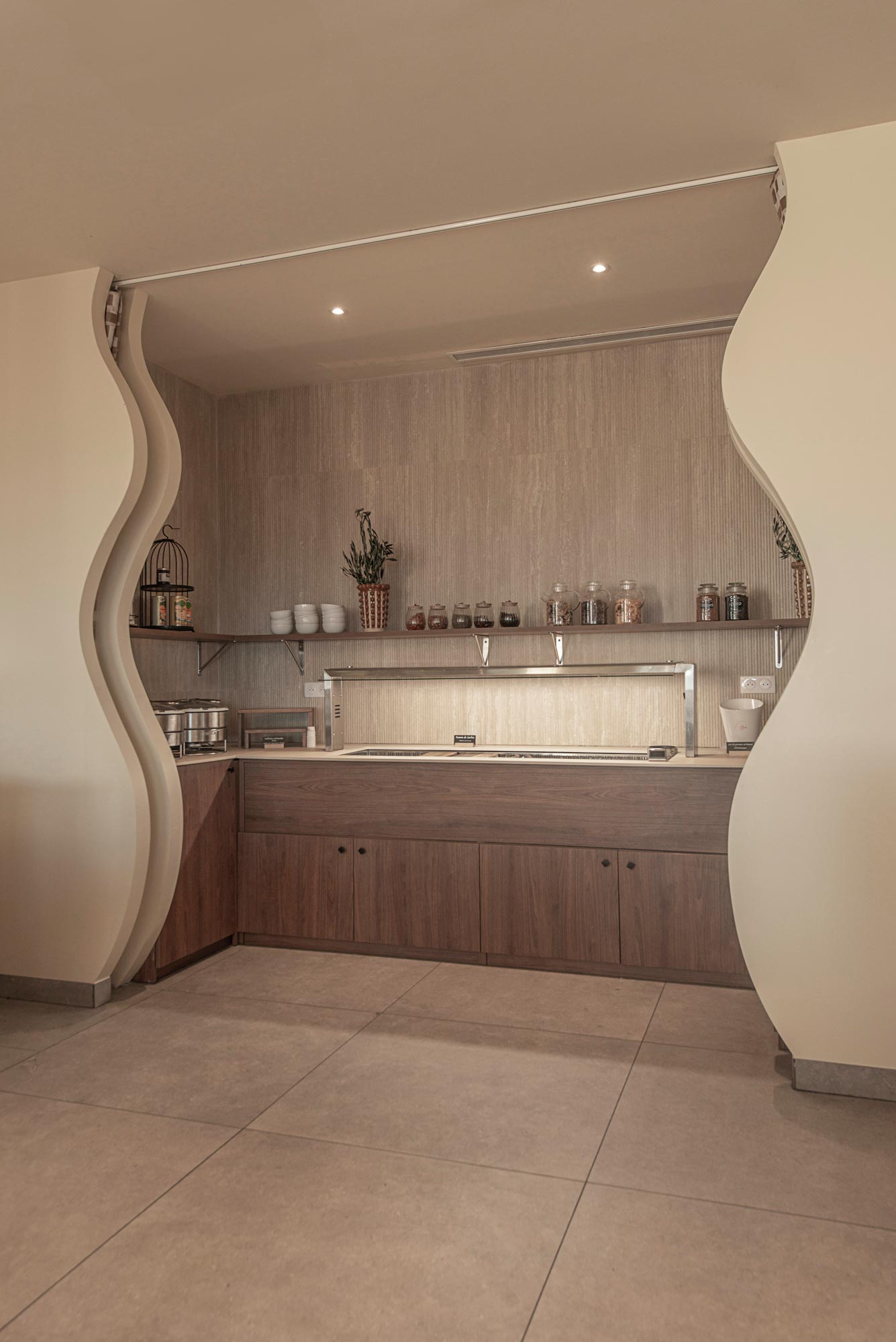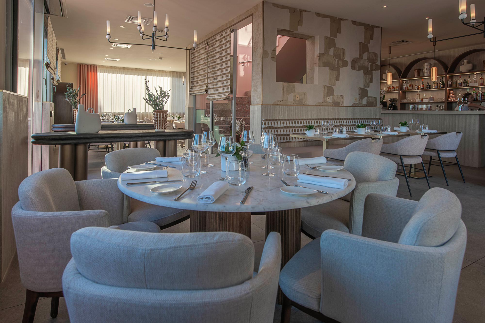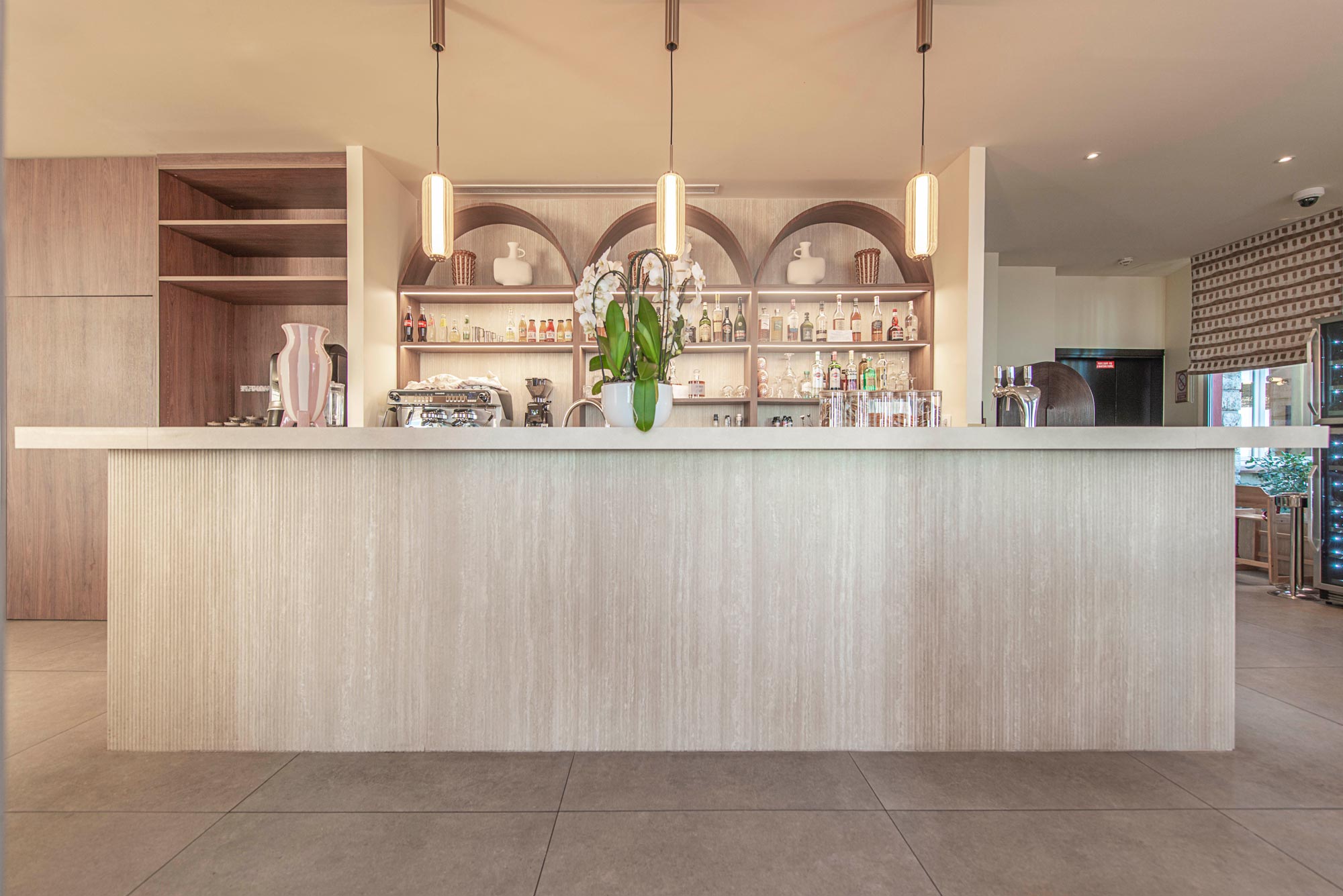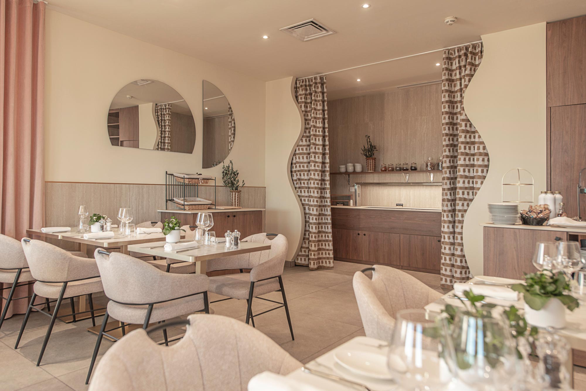 La courbe, inspirée de la vague, structure à nouveau les volumes et relie subtilement l’espace petit déjeuner à la salle du restaurant, créant une cohérence visuelle et narrative.